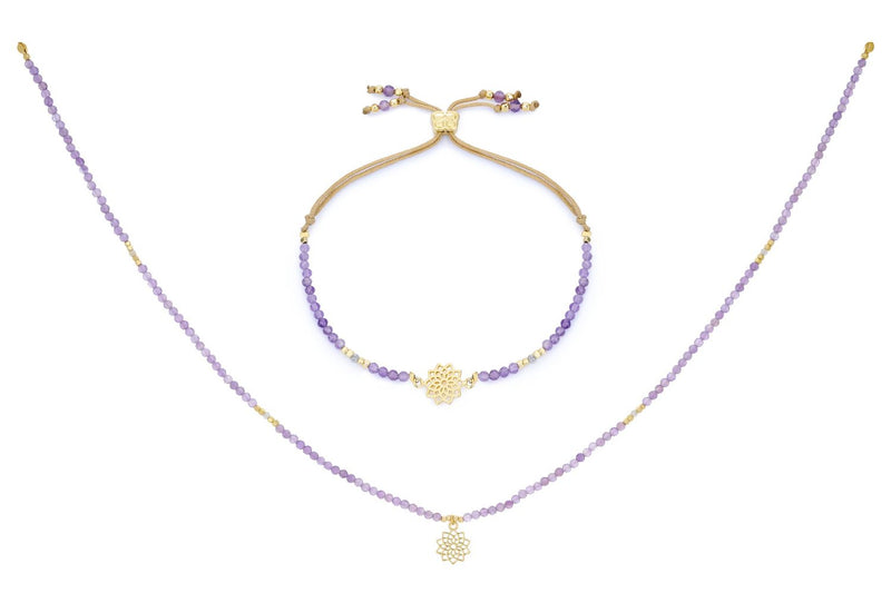 The matching necklace mirrors this dreamy palette with a delicate strand of amethyst beads, accented with gold touches that catch the light beautifully. Sitting softly at the collarbone, it carries the calming presence of amethyst and labradorite close to the heart, a little dose of spiritual balance wherever your day takes you. Wear the pieces together for full chakra-aligned harmony, or style them separately for subtle, soulful sparkle.