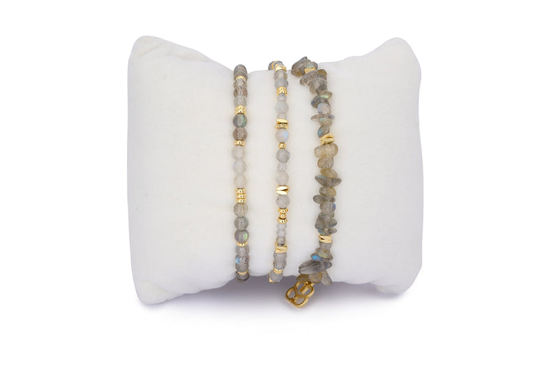The Sana bracelet features raw-cut labradorite chips on a stretch band, organic, grounding, and naturally beautiful. Bliss brings delicate faceted stones with gold accents and an adjustable pull-tie fit for everyday ease. And Wonder is a stretch bead bracelet that adds just the right amount of shimmer with polished labradorite beads and a whisper of gold.
