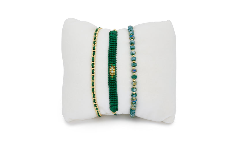 Elevate your wrist game with our 3-Layered Gemstone Bracelet Stack Fidda. Featuring Jump—a chic adjustable Miyuki Bead Silver Tone Bracelet, Braid—a handmade contrasting cord and gold bead woven bracelet with a stylish friendship fastening, and Prunus—a stretch bracelet adorned with stunning crystals and gold balls. Unleash your style with this versatile gemstone trio
