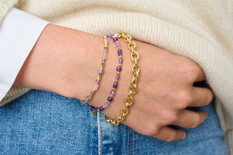 With a rich mix of amethyst gemstones and golden textures, this layering bracelet set radiates boho-luxe energy, grounded yet radiant, easy yet full of meaning.
