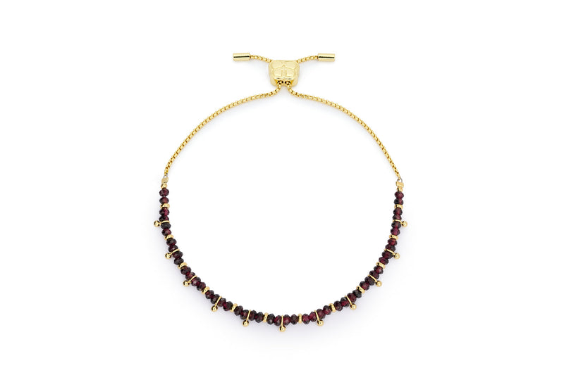 This elegant garnet bracelet features a delicate gold chain and shimmering faceted garnet beads, spaced with tiny golden aura beads for a radiant glow. Designed with a sliding clasp for easy wear and versatile fit, it’s a subtle statement that works just as well solo as it does in your bracelet stack.
