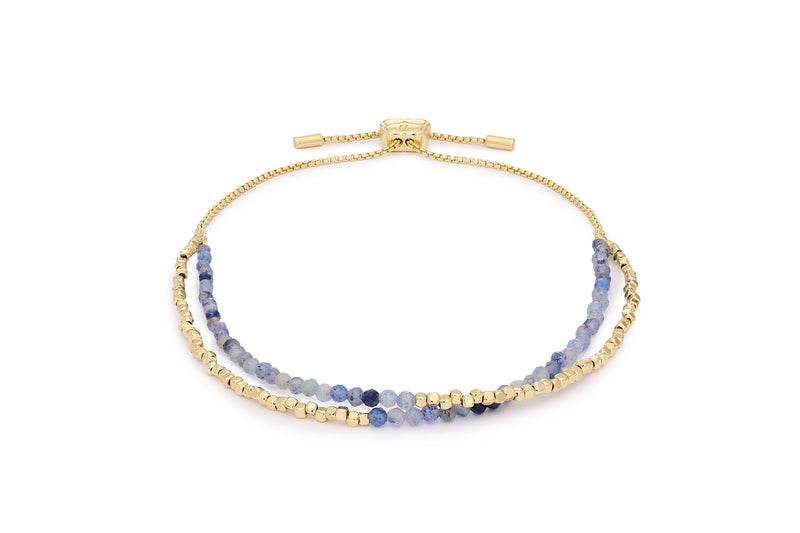 Softly shimmering and beautifully balanced, the Juniper Blue Aventurine Bracelet is a delicate layering piece designed to bring calm, clarity and effortless style to your everyday look. With twin strands of faceted blue aventurine beads and polished golden accents, this lightweight bracelet flows with an easy, boho-luxe energy that makes it the perfect companion for every occasion.