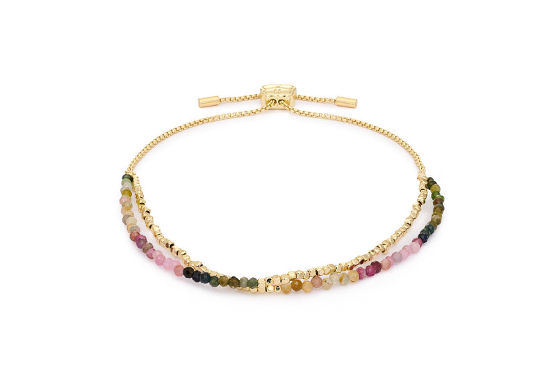 Colourful, radiant and full of positive energy, the Juniper Gold & Tourmaline Double Strand Bracelet is a joyful celebration of gemstone beauty. Featuring two delicate strands, shimmering with faceted multi-coloured tourmaline beads and strung with gleaming gold accents, it’s the kind of earthy boho bracelet that feels like happiness you can wear.