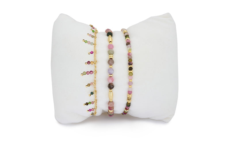 Elevate your style with our captivating 3-layer bracelet set, showcasing the enchanting trio of tourmaline and gold-plated bracelets. The combination of Dash Tourmaline, Fresco Tourmaline, and Heather Tourmaline creates a harmonious blend of colours and textures that effortlessly adds a touch of sophistication to any outfit.