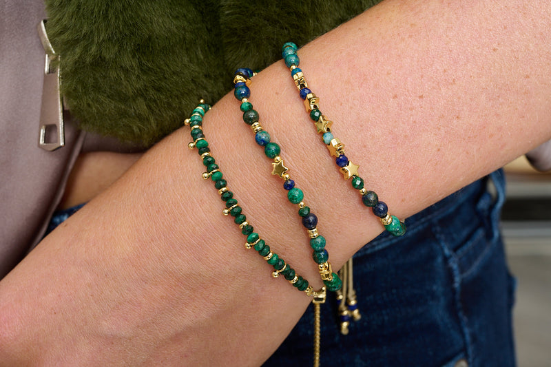 Each bead bracelet brings its own energy to the mix, emerald green malachite for growth and courage, azurite for wisdom and insight, and golden accents for warmth and strength. Together, they create a vivid, grounding harmony that feels both empowering and effortlessly boho-luxe.