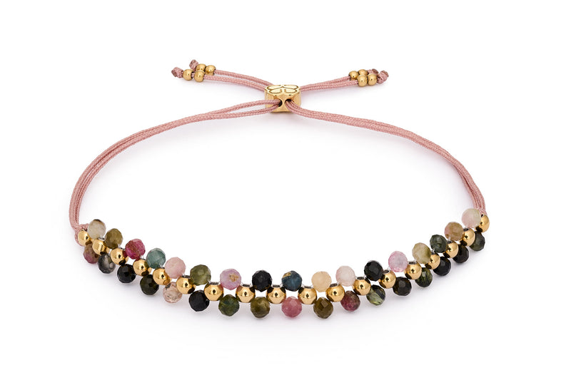 Colourful, vibrant and brimming with positive energy, the Marisol Tourmaline Bracelet is a celebration of life’s little joys, captured in gemstones. With its playful mix of faceted tourmaline beads, golden accents and blush pink thread, this friendship bracelet is your personal reminder to embrace each day with confidence, connection and a little sparkle.