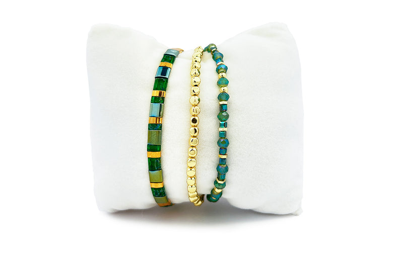 Made for real life, each bracelet slips on in a heartbeat with a comfortable stretch fit. Golden accents bring a refined finish, while the green palette keeps everything grounded and wearable from desk to dinner, city showers to seaside escapes.