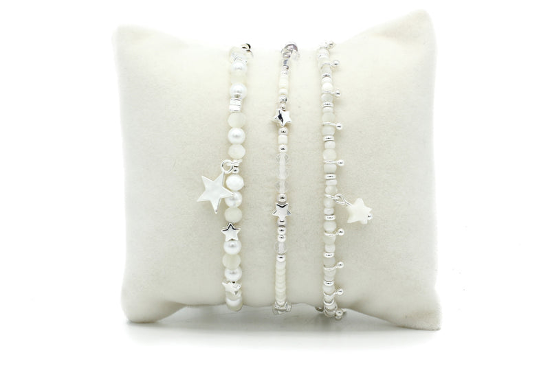 The Orion II Stack with luminous pearls, ethereal moonstones, and silver star accents, this three-bracelet set was made for candlelit dinners, silky slip dresses, and dancing barefoot under the stars. Gift it. Wear it. Love it.