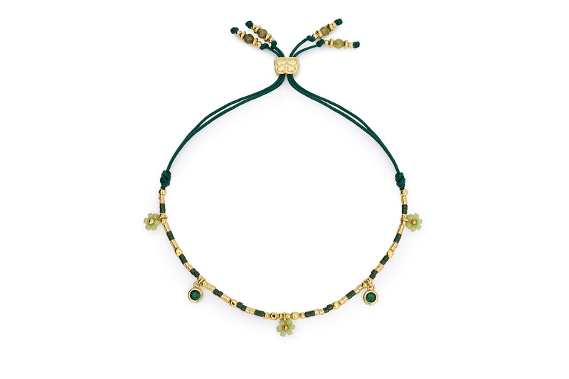 This adjustable bracelet features a deep green cord slider threaded with soft matte seed beads, glinting gold accents, and playful floral charms that bring the whole piece to life. Pops of green crystal detailing make this one part beaded bracelet, part charm bracelet, and completely stackable. A celebration of calm, confidence, and connection, all in one golden-layered treasure.