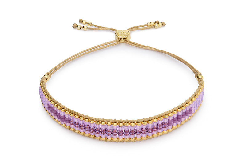 Handwoven with care and creativity, this woven bracelet is designed to wrap your wrist in comfort and colour. The glimmering gold accents add texture and warmth, while the vibrant beadwork blends lavender, lilac and berry tones in a pattern that feels joyful, confident, and full of personality. Finished with an adjustable design, this thread slider bracelet is made for layering, gifting, and showing off your unique energy.