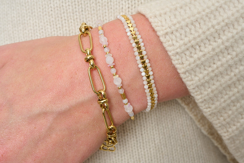 Rainbow moonstone is known for its connection to intuition and emotional balance, while white shell is believed to bring peace and purity. The gleaming gold chain completes the trio with structure and sophistication, a subtle reminder of resilience wrapped in radiant light.