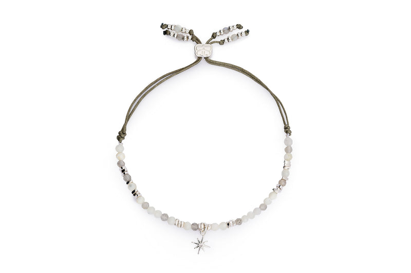 The soft, silvery tones shimmer with gentle magic, while the silver starburst charm at the centre adds a symbolic touch of light and direction. Threaded on a khaki cord with a smooth slider fit, Una is a versatile bracelet that’s both grounding and ethereal, a perfect cord bracelet for stacking or gifting with intention.