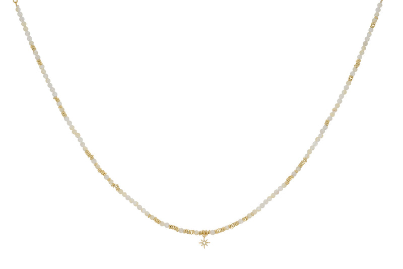 With delicate white moonstone beads, luminous mother of pearl, and warm golden accents, this gemstone necklace feels like sunlight wrapped in lace. Finished with a starburst charm, it’s here to remind you that even in stillness, you shine.