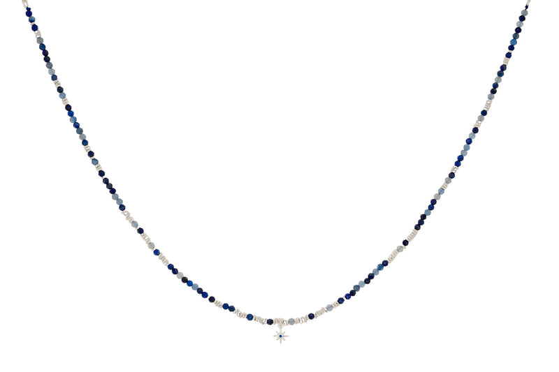 There’s something quietly powerful about deep blues and starlit silver. Meet the Yolanda Beaded Necklace, a celestial blend of meaning and style, featuring a dreamy mix of lapis lazuli and kyanite, finished with a dainty starburst charm. It’s grounding and light-catching all at once, like the night sky you wear on your skin.