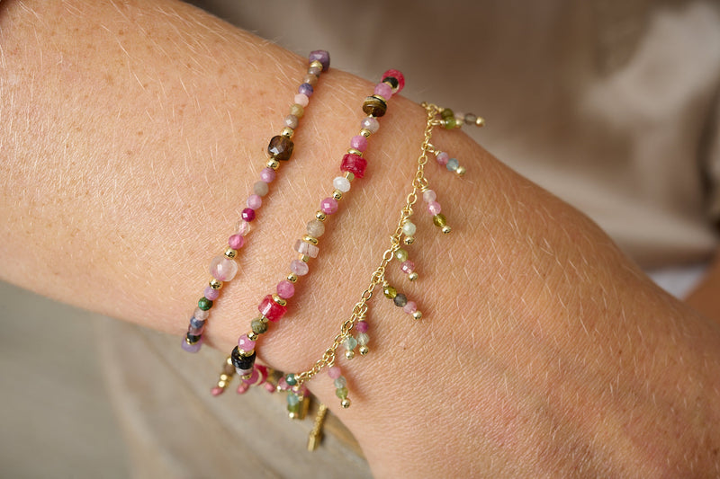 Worn as a set, Zelda has beautiful rhythm and movement. The slim gemstone strand lays a soft wash of colour; the mixed-bead bracelet adds sculptural texture and little flashes of light; the dainty chain with tourmaline drops brings playful sway with every gesture. It’s effortless, feminine and joyfully wearable, subtle enough for daytime, pretty enough to elevate your evening.
